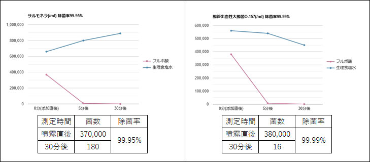 サルモネラ菌、腸管出血性大腸菌O-157に対して短時間で99.9%以上の除菌に成功しました。