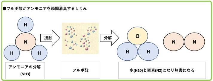 例えば上図のように、ニオイの代表格であるアンモニア(NH3)にフルボ酸を直接噴霧するとアンモニアは水(H2O)と窒素(N2)に分解され無害になります。